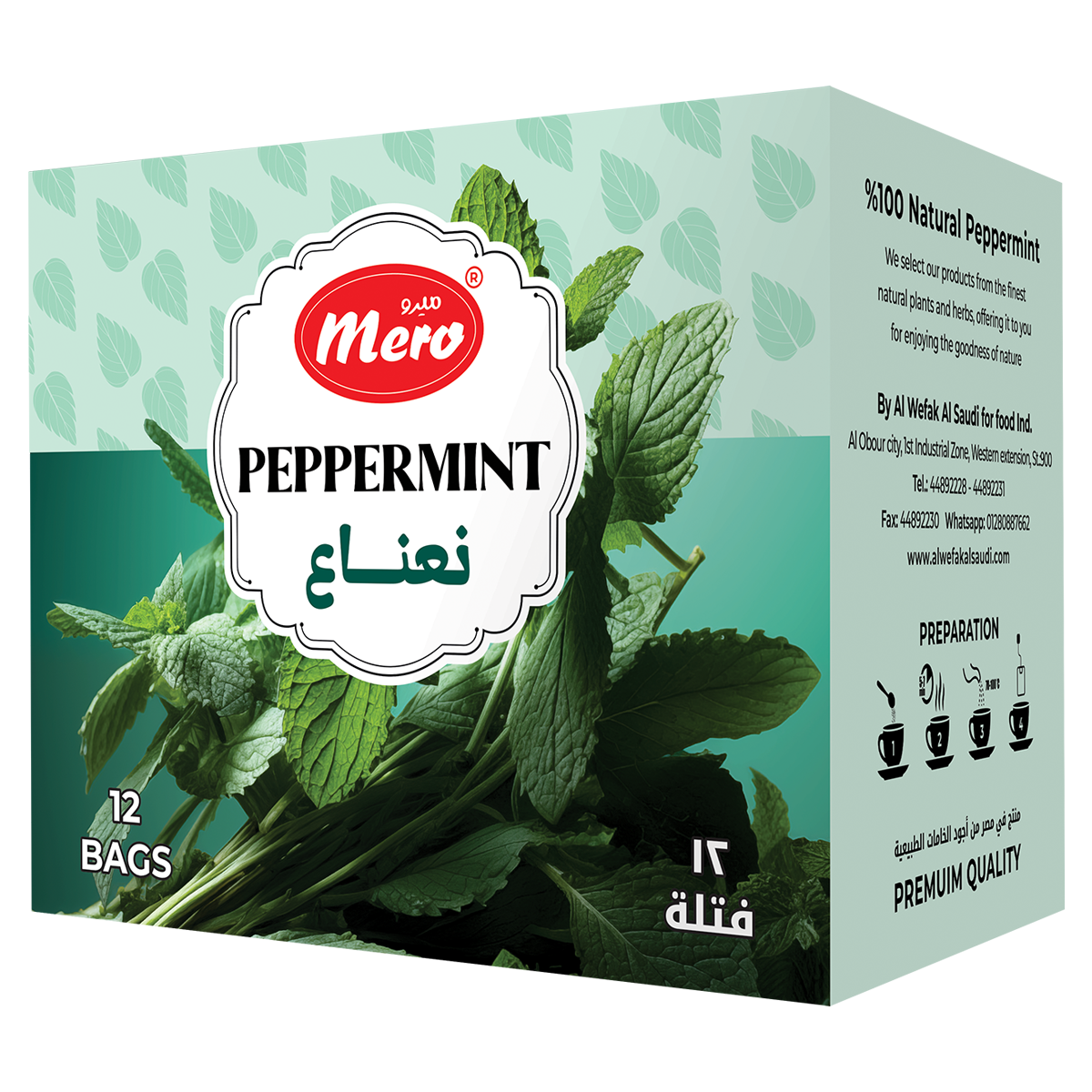 Al Wefak Al Saudi for Food Industries presents Mero Peppermint Herbal Tea, crafted from pure, dried peppermint leaves for a refreshing, cooling flavor and soothin